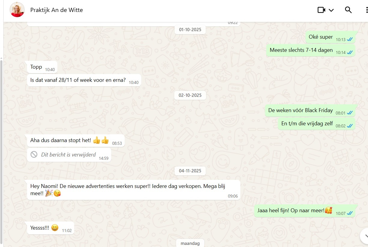 > De 1-op-1 strategie call (bij de start) en 1-op-1 Meta Ads Performance audit (later gedurende jouw traject) zijn volledig één op één.